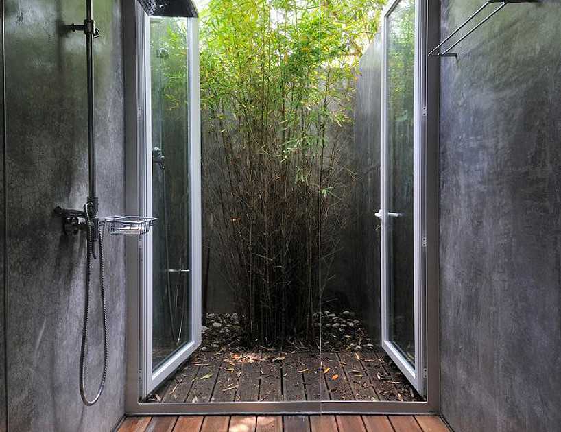 Такая душевая кабина полностью обнажает свое пространство перед красотами заднего двора или сада. От абсолютного слияния с природой ее отделяет только стеклянная стена. Подходит владельцам загородных домов с максимальными возможностями в плане приватности.
