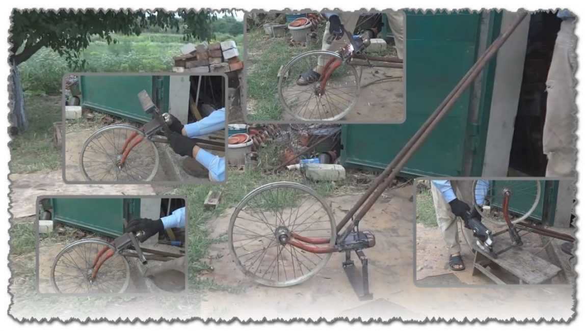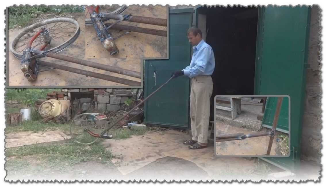 К вилке нужно приварить две трубы, которыми будет осуществляться управление прополочного агрегата. Главное, что нужно соблюсти – это горизонтальное положение вилки от велосипеда.