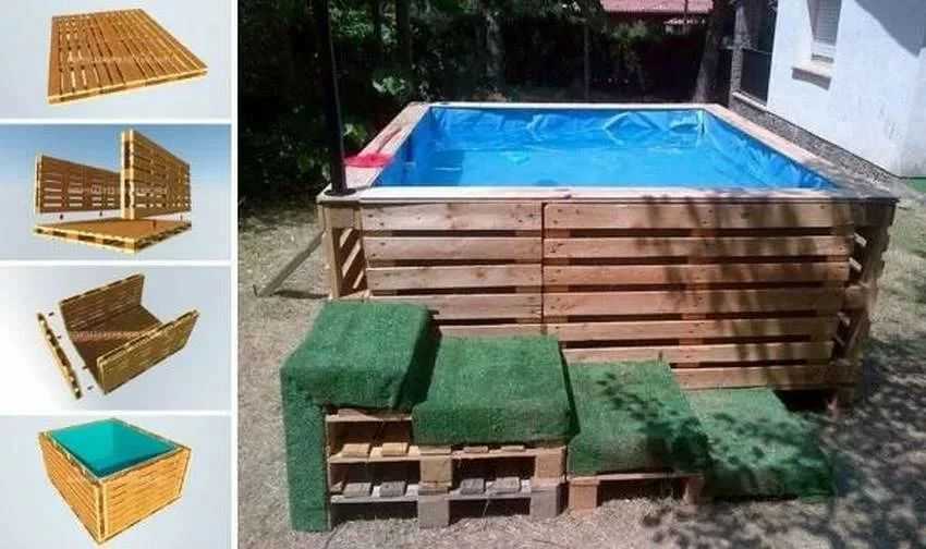 Для устойчивости конструкции используют стяжные ремни и дополнительные опоры. Все деревянные элементы обрабатывают антисептиком и защищают с внешней стороны от негативных погодных воздействий. Поддоны можно использовать в качестве подставки под бассейн.