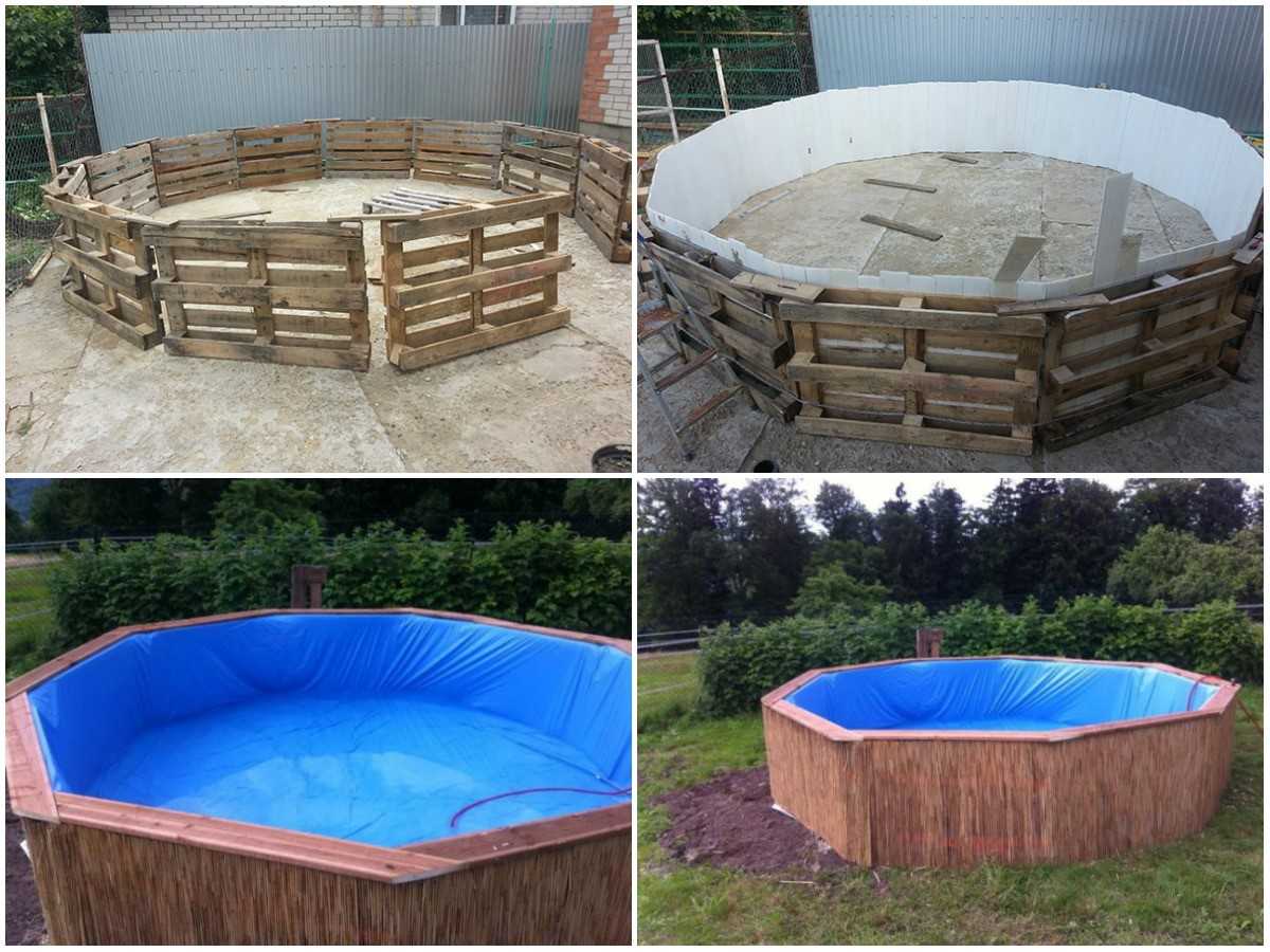 Для изготовления каркаса сооружения используют деревянные поддоны, которые сколачивают вертикально по кругу. Для среднего бассейна понадобится 9-11 поддонов. Благодаря оптимальной высоте каркаса получится конструкция большой вместительности на 3-4 человека. К деревянным элементам удобно крепить горку и ступени. Деревянный бассейн не требует устройства котлована.