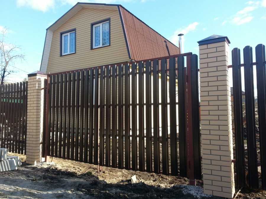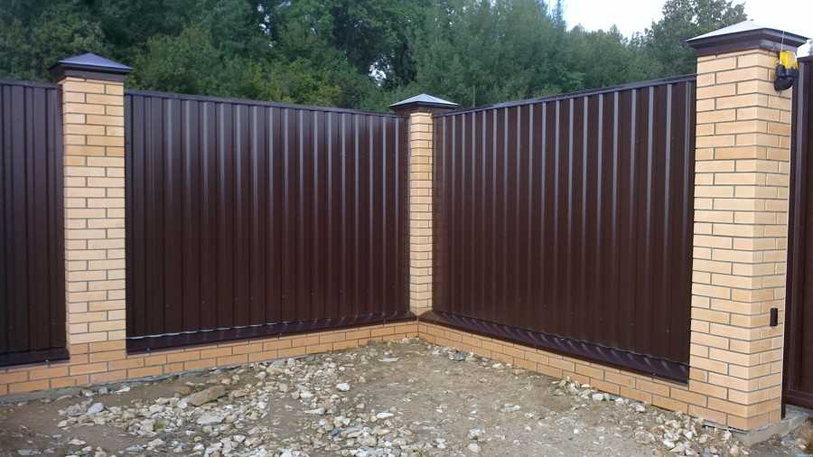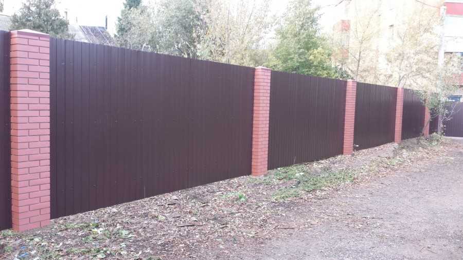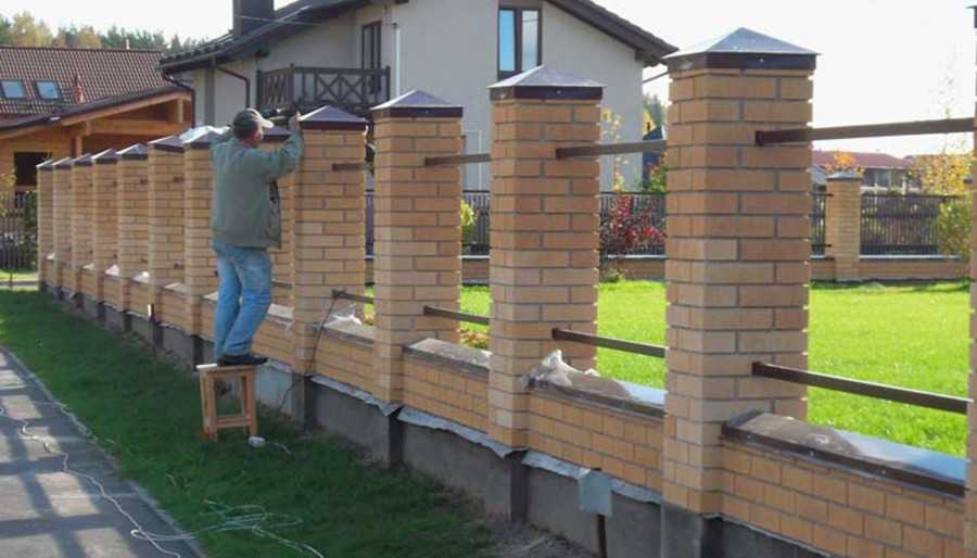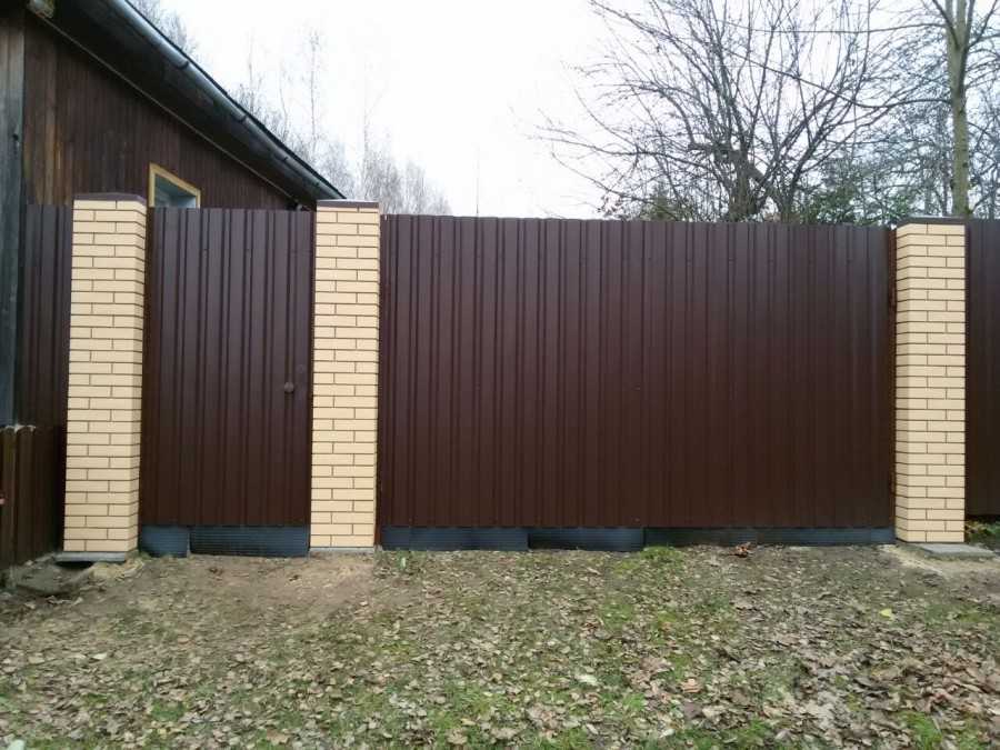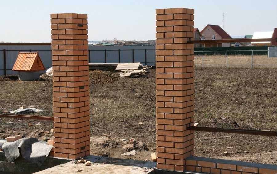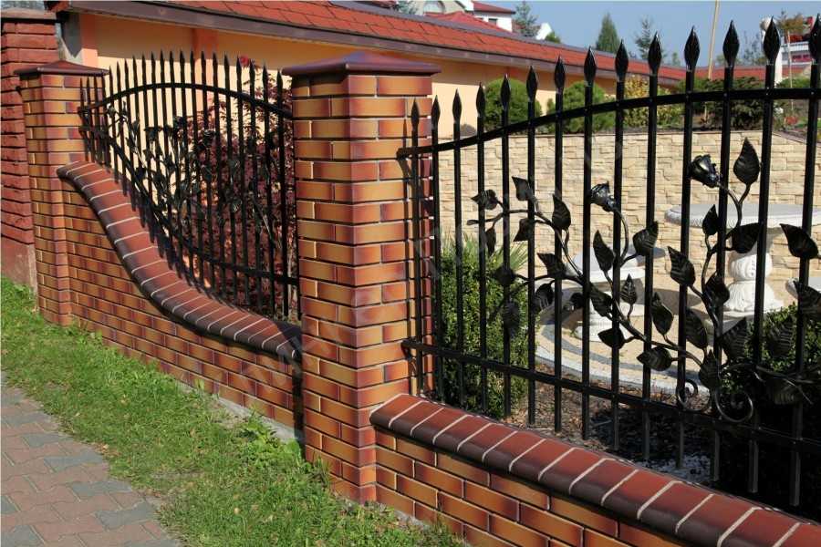 кирпич. Презентабельно выглядят заборные опоры, изготовленные из отожженного кирпича. Массивные опорные элементы обеспечивают неподвижность конструкции благодаря повышенным прочностным свойствам