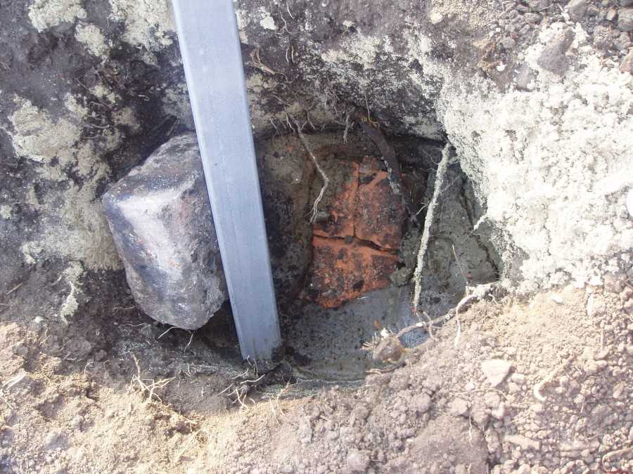 - нижнюю часть ямы заливают бетоном, засыпают щебнем и утрамбовывают. В траншею опускается столб, который засыпается щебнем и трамбуется еще раз.