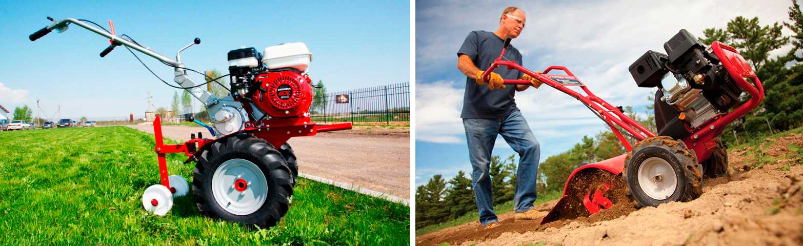 Мотоблоки имеют два пневмоколеса, за счет чего более стабильны. Усилия при работе минимальны, приходится лишь контролировать направление.