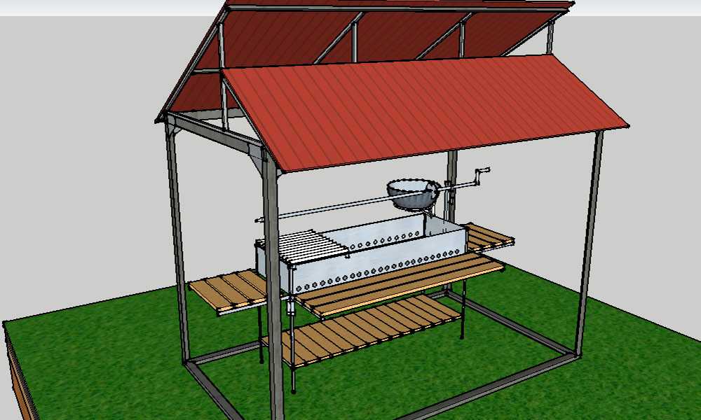 Общие принципы сборки металлического каркаса для стационарной беседки и маленького навеса над самой жаровней примерно одинаковы. Во втором случае столбики опор никуда не вкапывают, а приваривают к ножкам или корпусу мангала. Дальнейшие действия заключаются в следующем: