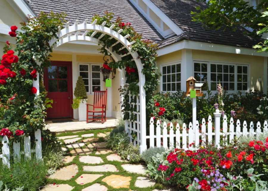 Белый заборчик с аркой – хорошая идея для оформления палисадника