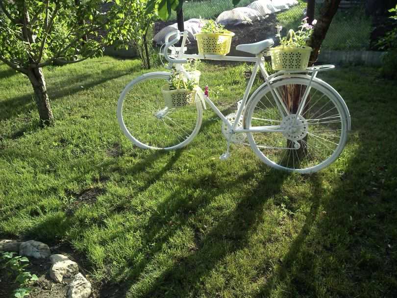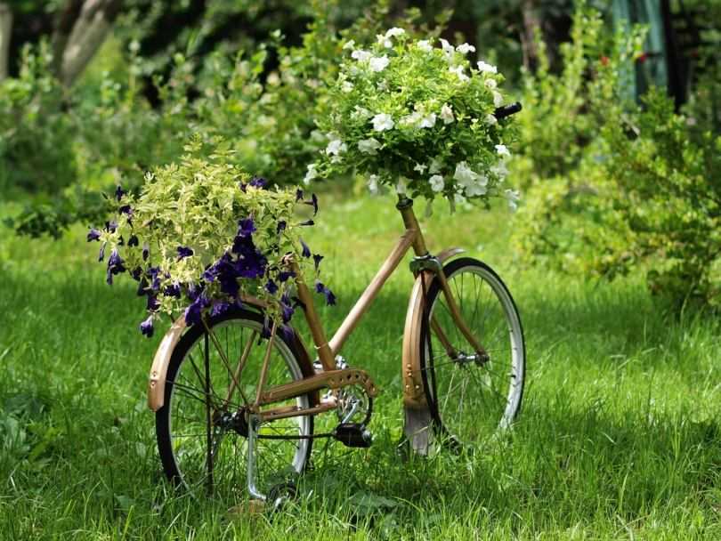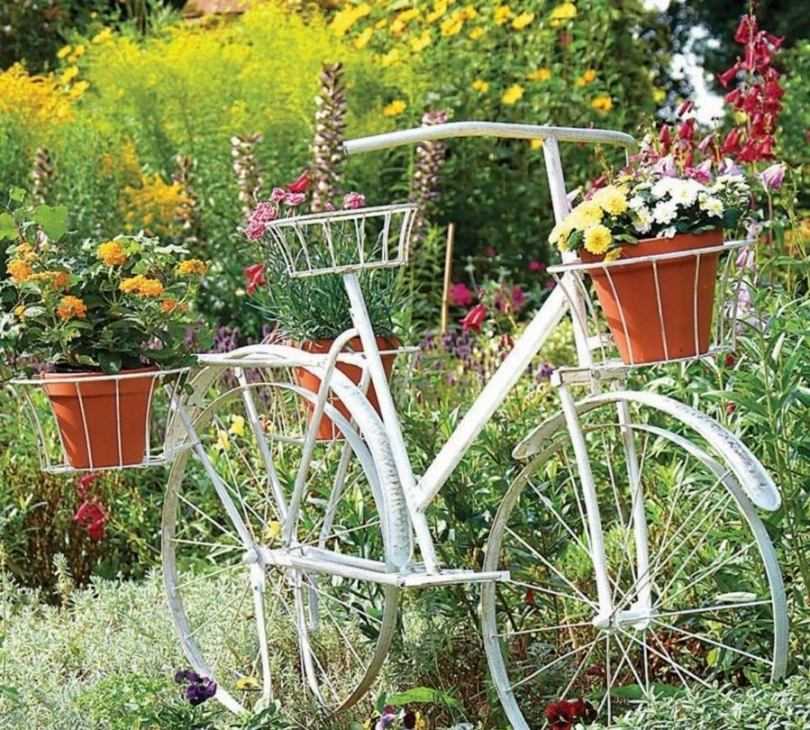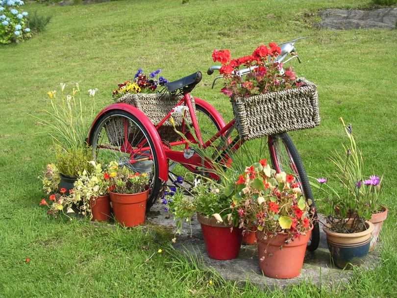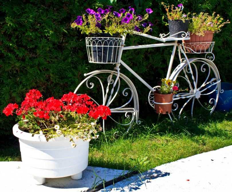 Кашпо для цветов можно сделать из разных материалов и предметов. Например, почти у всех на даче имеется старый велосипед. Покрасив его в яркий цвет и прикрутив красивые ящики или корзины, можно получить оригинальное кашпо в винтажном стиле.