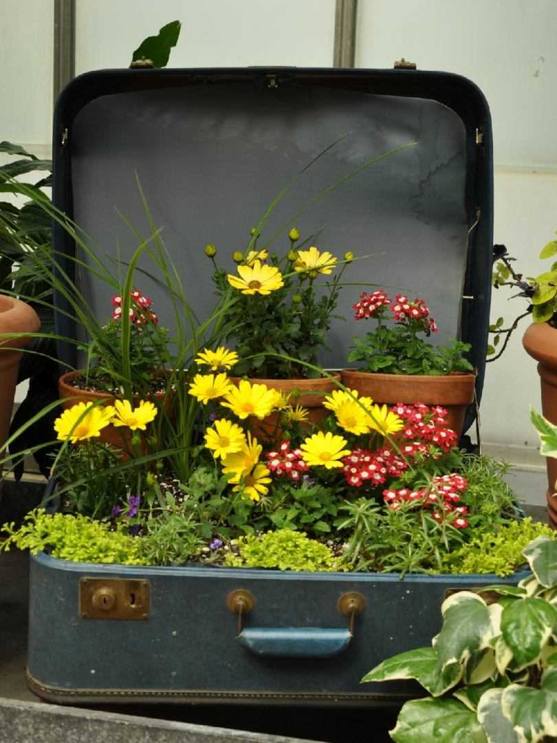 В интернете можно встретить множество оригинальных идей кашпо для дачи из пластиковых или стеклянных бутылок, из клеток для птиц, старых бочек, ведер, старой мебели и даже из рояля.