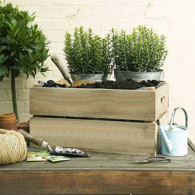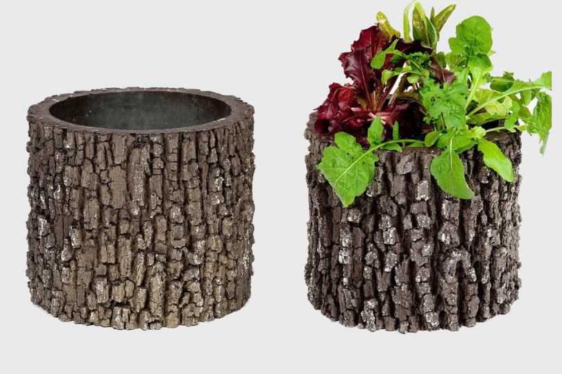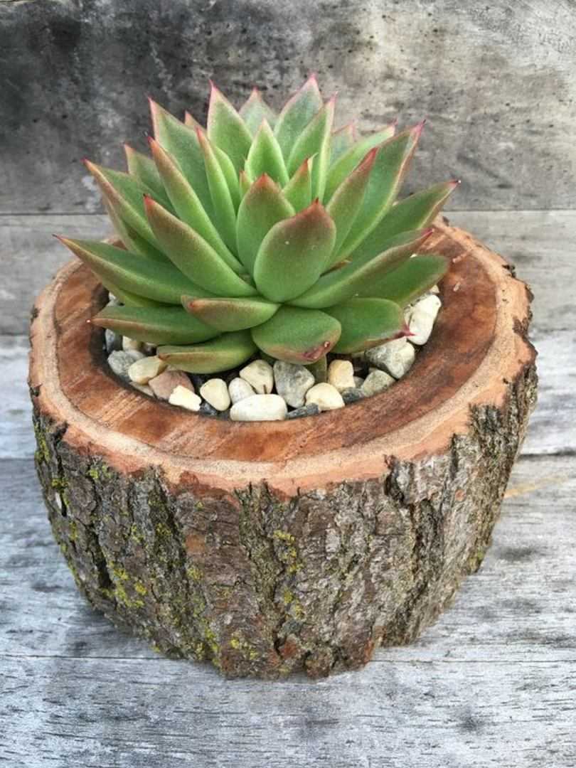 Также ящик для цветов можно сделать из большого полена. Для этого необходимо удалить сердцевину с помощью инструментов, затем обработать антисептиком, вставить подходящее по размеру пластиковое кашпо и посадить цветы.