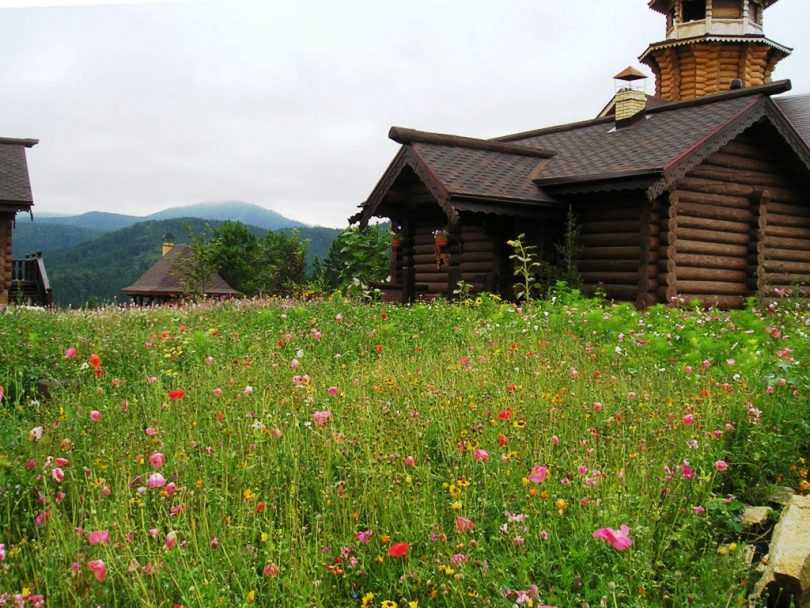 Русская усадьба. В полной мере реализовать такой стиль можно на просторном участке. Для оформления стоит высадить несколько типичных для нашего региона деревьев – дубы, липы, ели. Для озеленения обустраивают лужайки из клевера и одуванчиков вместо газона. Органично в саду будут смотреться различные кованые элементы – арки, лавочки, перголы, беседки.