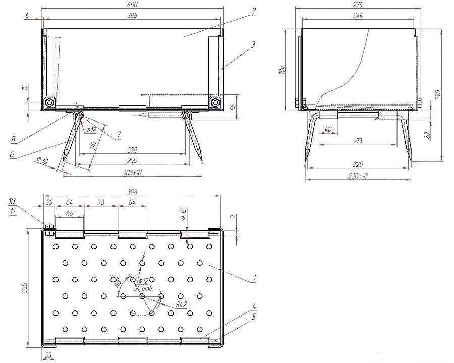 Чертеж при сборке мангала своими руками является желательным, но съема. Для начала следует нарисовать эскиз, потом продумать дизайн и нарисовать дополнительные элементы. Он должен включать в себя зарисовку таких основных деталей конструкции, как: