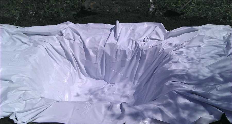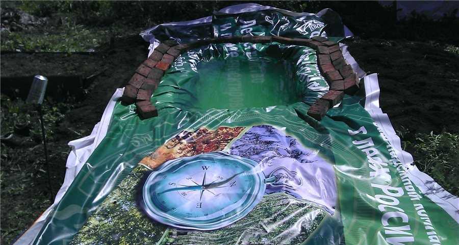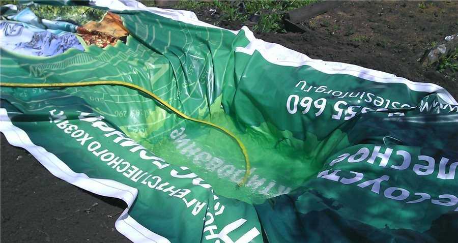 Если нужен экспресс-вариант бассейна с минимальными затратами — можно обойтись плотной пленкой. Например — старым баннером. Ткань для них используется плотная, а купить в агентстве старый можно за сущие гроши. Если вам нужен бассейн в огороде — это именно тот материал: затраты минимальны.
