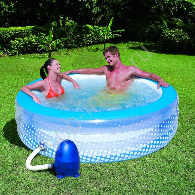 В некоторых семейных моделях имеется функция джакузи. Массаж водой позволяет расслабиться. При покупке важно правильно подобрать место расположения зоны отдыха. Для опустошения и быстрого складывания изделия важно, чтобы оно было оснащено специальными сливными клапанами. Для длительного использования рекомендуется покупать изделие с фильтром-насосом, чтобы вода не застаивалась и всегда была чистой.