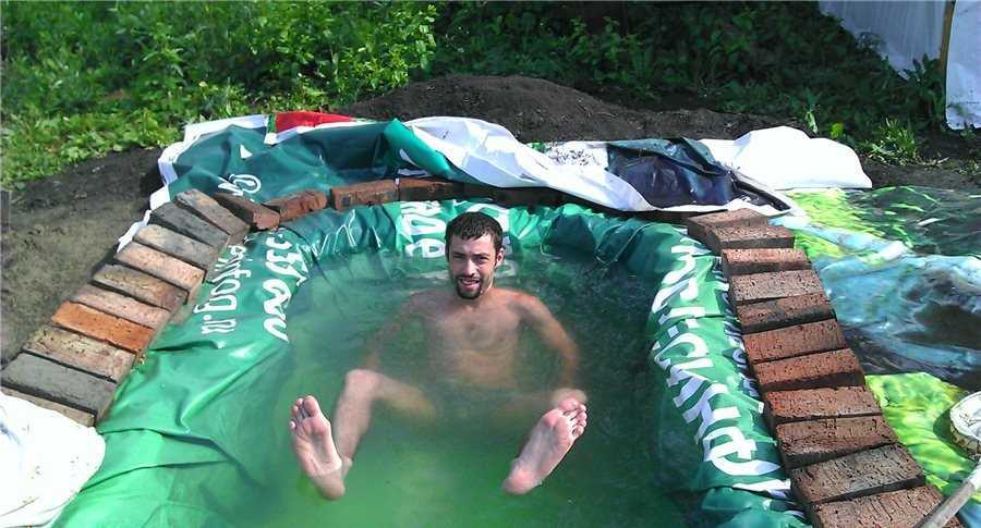 Это, конечно, не супер вариант, но освежиться можно. Времени на «строительство» потребовалось 2 часа. Основное — выкопать котлован. А дальнейшее — дело нескольких десятков минут. На фото ниже та же идея, реализованная в большем масштабе. Пленку покупали для бассейнов и спаяли два куска — чтобы получилось более объемное «море».