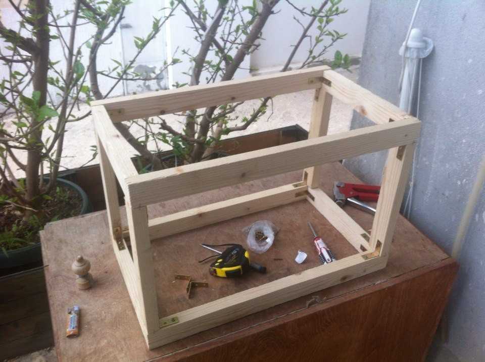 Для красоты древесину часто шлифуют, а затем еще и красят, но первую процедуру разумнее делать до сборки конструкции, а вторую – уже после сборки. Отшлифованные рейки нарезают так, чтобы составить из них два одинаковых прямоугольника, которые станут противоположными стенками. Соединить их между собой можно либо несколькими отдельными распорками, либо еще двумя равными прямоугольниками. После всего этого по размеру одной из стен нужно сделать еще один прямоугольник – он будет выполнять функции двери. Для идеальной правильности всех углов большинство мастеров советует использовать специальные металлические уголки небольшого размера, продающиеся где-то по соседству с теми же пиломатериалами.