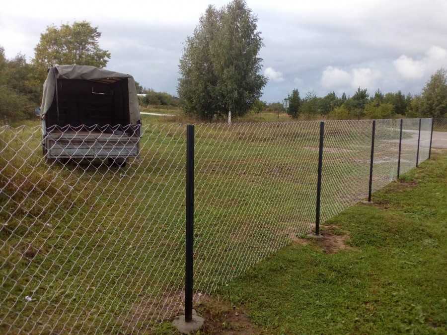 Проще всего изготовить забор натяжным способом. Для этого требуется Рабица в рулонах, столбы (металлические, деревянные, железобетонные или асбестоцементные) и проволока.