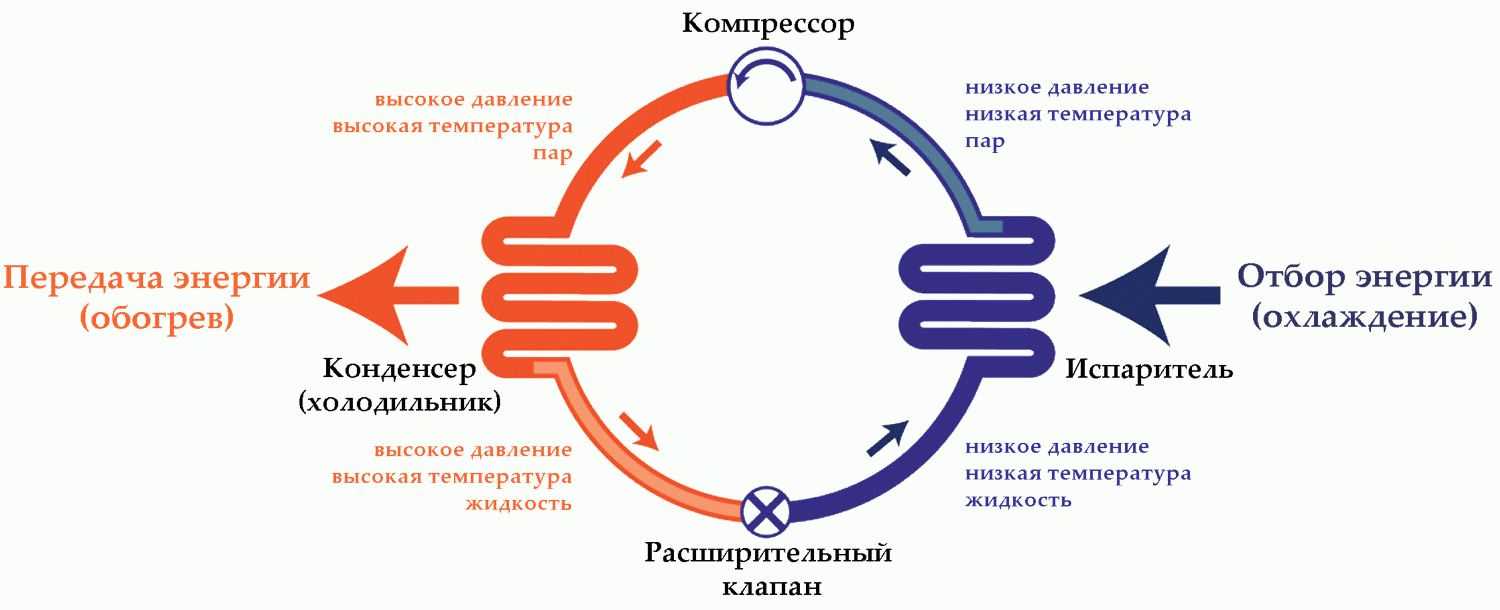 Тепловые насосы бывают различных конструкций и забирают тепло от нескольких источников: воздух, почва, вода. Чтобы было понятнее, покажем принцип работы на примере устройства теплового насоса, забирающего тепло из горячего воздуха.