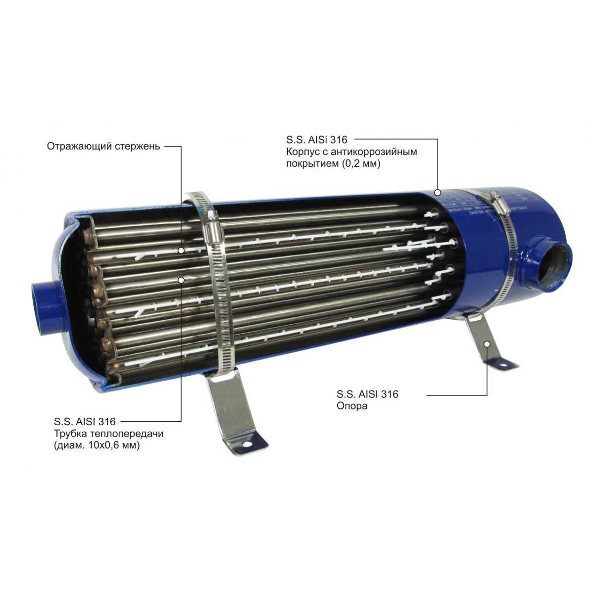 Конструктивно теплообменник для бассейна представляет собой цилиндрический корпус с двумя контурами: в первом, представляющим собой непосредственную полость прибора, циркулирует жидкость из бассейна, а во втором расположено устройство, по которому перемещается теплоноситель – горячая вода. В роли устройства для нагрева жидкости выступает или трубка, или пластина.