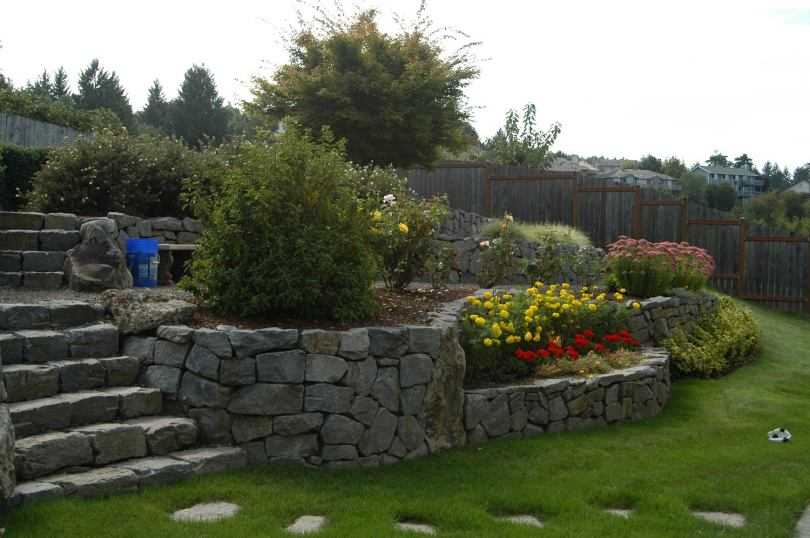 Работа с рельефом была минимальной, но без террасирования обойтись не удалось. Вся центральная часть была выровнена и отделена от нижней террасы невысокой подпорной стенкой из натурального камня песчаника.