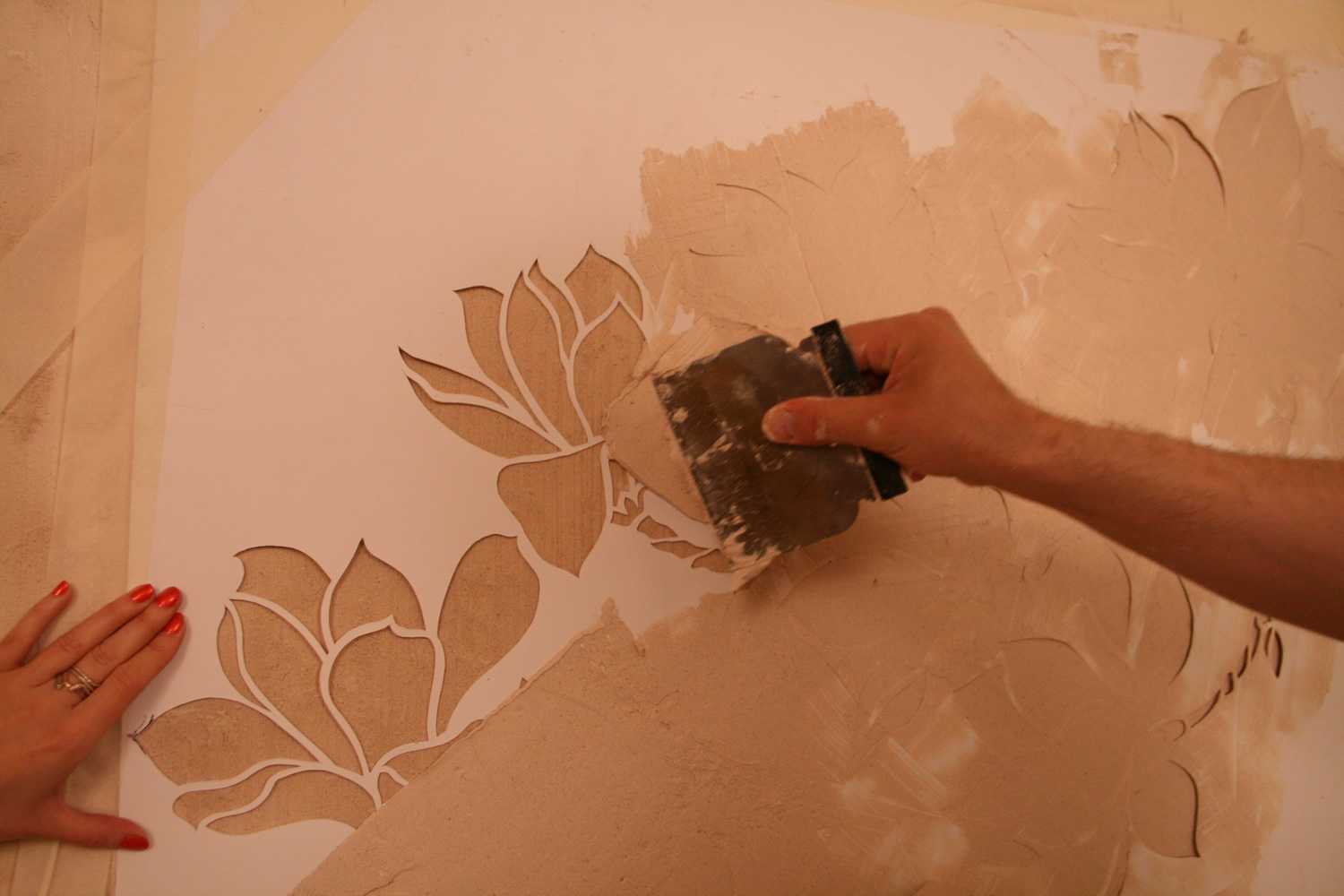 Нанесение барельефа в этом случае начинается с подбора рисунка и перенесения его на подготовленный материал. Затем нужно прорезать контуры отдельных фрагментов и прикрепить картон к стене. Шпателем намазать гипсовый раствор на прорезанные части, захватывая области трафарета вокруг них. При этом формируется рисунок с плоской поверхностью, выступающий над фоном на 2-3 мм. После того как он немного окрепнет, картон нужно аккуратно снять, добавить мелкие детали, если это необходимо и перейти к следующему изображению, прикрепляя трафарет рядом или в любом нужном месте стены.