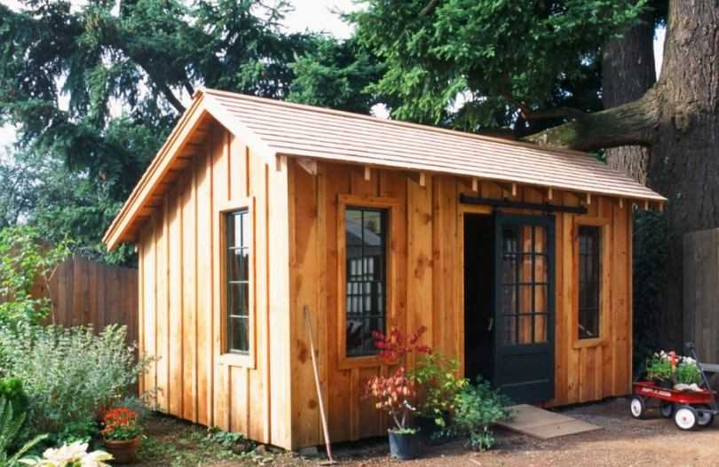Для хранения садового инвентаря можно использовать небольшой хозблок, пристроенный к стене дома