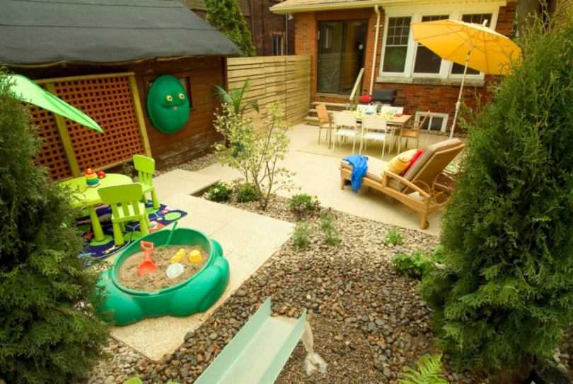Если дети взрослые, на проекте планируют небольшую спортивную площадку. Пара турников помогут домочадцам держать себя в форме. А площадку для маленьких детей обязательно засыпают песком. Это безопасно, если ребёнок упадёт с качелей или свалится с горки.