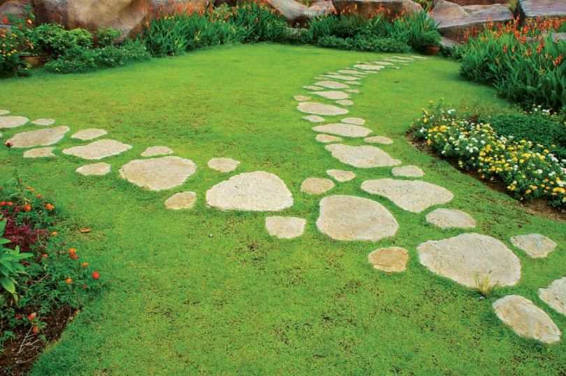 Садовые дорожки не только разделяют участок на зоны, но и придают ему аккуратный, опрятный вид. Их выполняют из камня, кирпича, дерева, бетона, булыжников, ПВХ, щебня или гальки, бутылочных пробок и даже кусочков кафеля. Для создания нетривиальной ландшафтной композиции или для оживления унылого, ровного рельефа используют ступени. Также они жизненно необходимы для упрощения подъема, если владения разместились на уклоне. Ступеньки могут быть каменными, кирпичными и деревянными. Они вносят свою лепту в эстетику пейзажа и усложняют геометрию участка. Самый распространенный вид цветников — клумбы. Растения для них нужно подбирать, исходя из особенностей климата. К примеру, в южных широтах легко приживаются нежные, чувствительные цветы, которые увянут в условиях северного климата (короткое лето, поздняя весна)