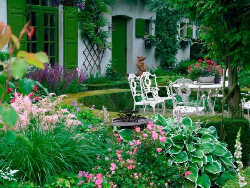 Этот стиль на первое место ставит уютную обстановку, умиротворяющую гармонию в оформлении. Преимущество отдается естественным природным материалам, обширному озеленению территории. Под раскидистыми кронами деревьев обустраиваются деревянные скамейки или лавочки. Обязательно поставьте на участке беседку в французском стиле.