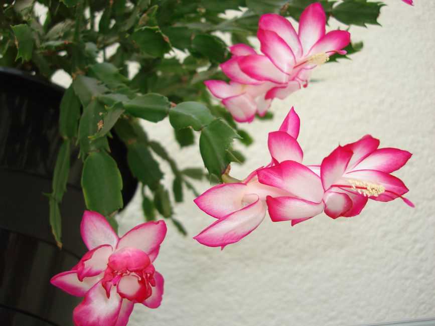 Шлюмбергера усеченная: белоснежные цветки растения с ярко-малиновой серединкой неправильной формы радуют взгляд