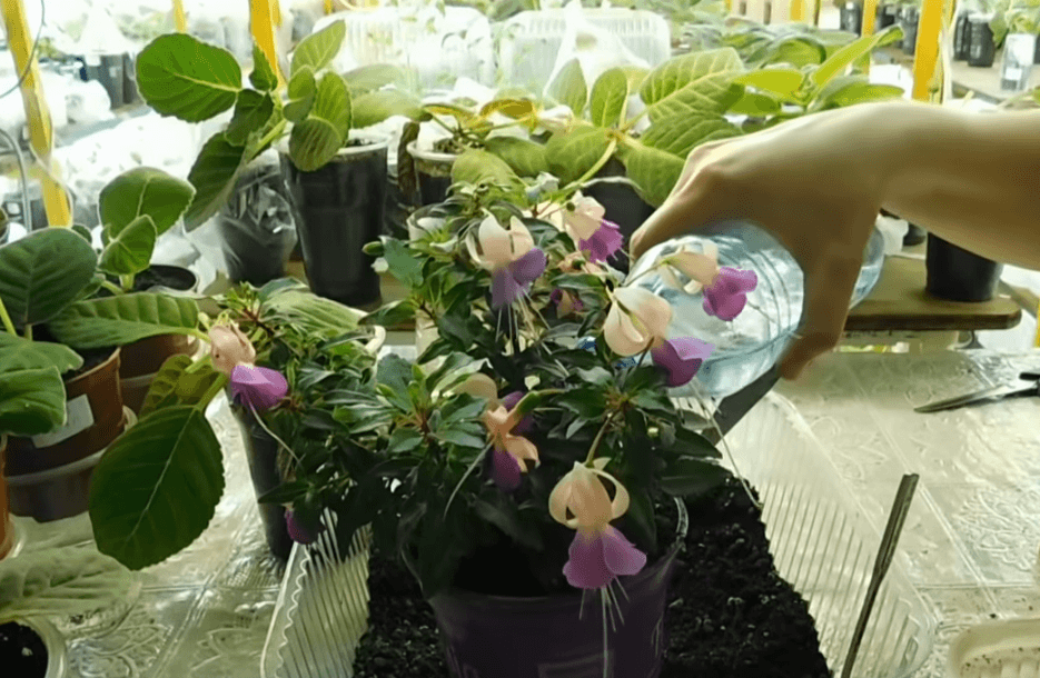 Фуксия не требует частого полива, но в период цветения или теплую погоду нужно поливать больше, чем обычно. Все этого для того, чтобы цветок не завял. Есть определенные требования — использовать только мягкую воду. Зимой стоит уменьшить количество воды до 1 раза в неделю. С середины октября по декабрь ему будет хватать 1 раза в месяц.