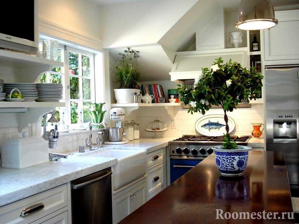 - Окно. Если площадь кухни маленькая, а зелени хочется видеть много, то устраивают в оконных проемах дополнительные полки для цветов. У этого способа есть один недостаток – цветы будут пропускать меньше света в помещение, следовательно оно будет казаться темным.