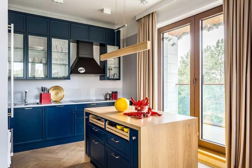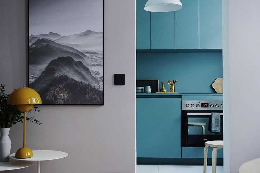 Синюю кухню не стоит сочетать ни с какими цветными стенами. Максимум – это еле-заметный серо-голубой тон стены. А лучше – просто белый.
