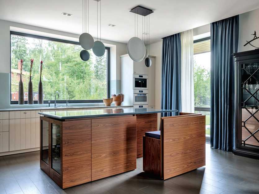 Разнообразие цветов, возможность экспериментировать с оттенками наиболее актуально для кухонь с большими габаритами. Игра цвета, фактур и материалов создают единый ансамбль, максимально раскрывающий потенциал помещения.