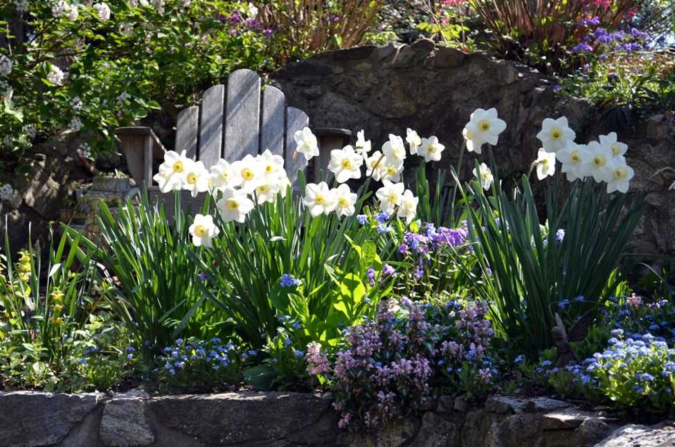 Можно просто разбавить нарциссы какими-нибудь другими растениями, которые обретают декоративность уже после того, как отцветут нарциссы, это замаскирует сохнущие листья, но я предпочитаю, когда нарциссы растут отдельно от других цветов.