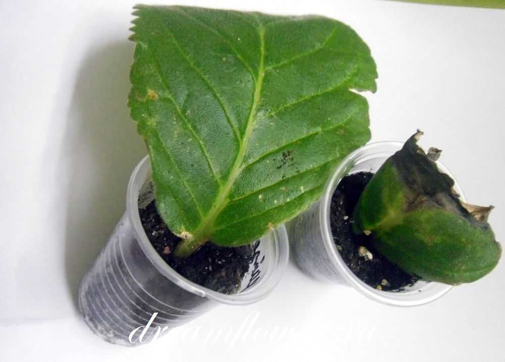 Для примера я взяла укорененные листики, которые были посажены около 3 месяцев назад. Один лист еще абсолютно здоровый и крепкий (его можно укоренить заново), второй начал подгнивать в тепличке, поэтому для повторного укоренения его использовать будет нельзя.