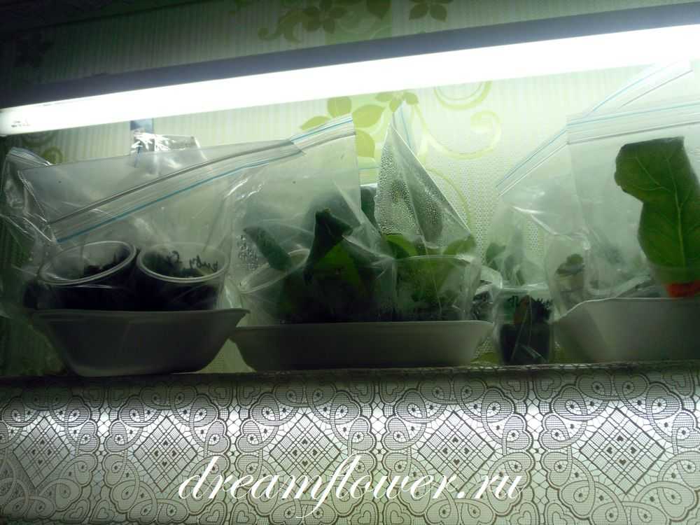 Производить полив листочка в целлофановом пакете не нужно, только поместить в самое освещенное место под рассеянные солнечные лучи.