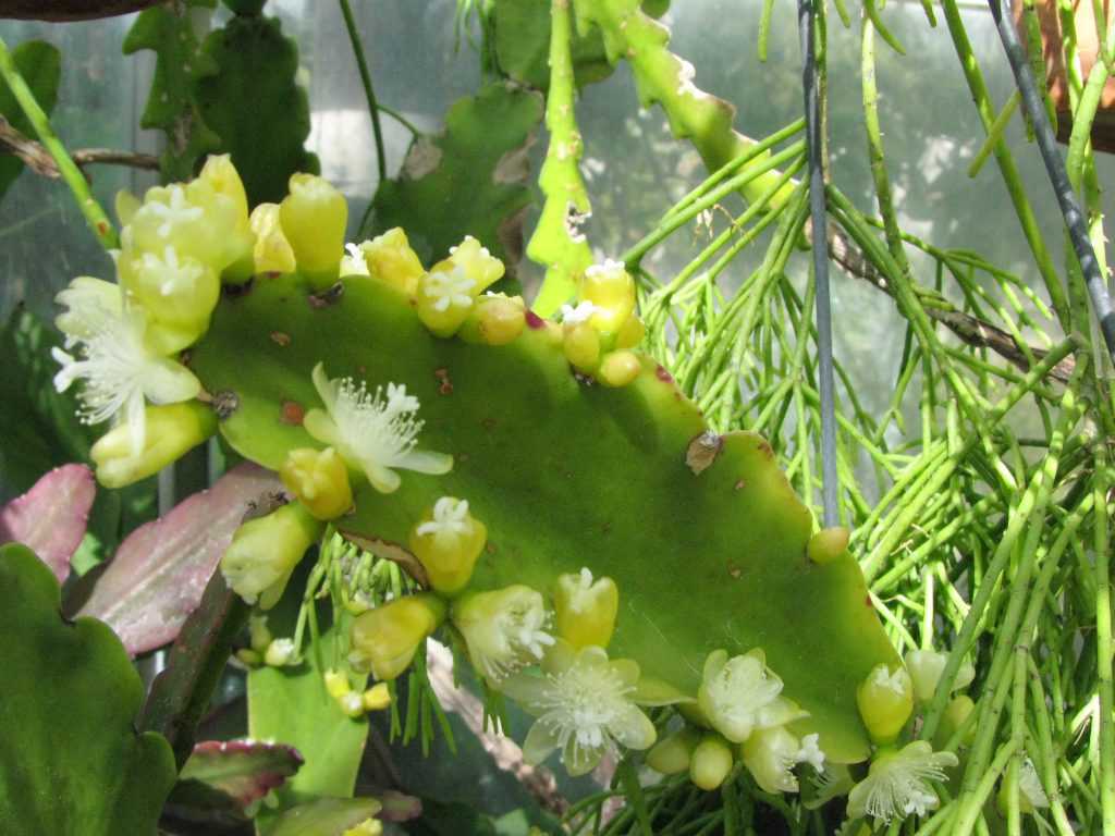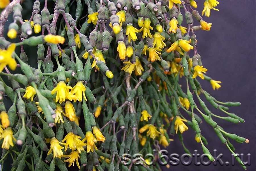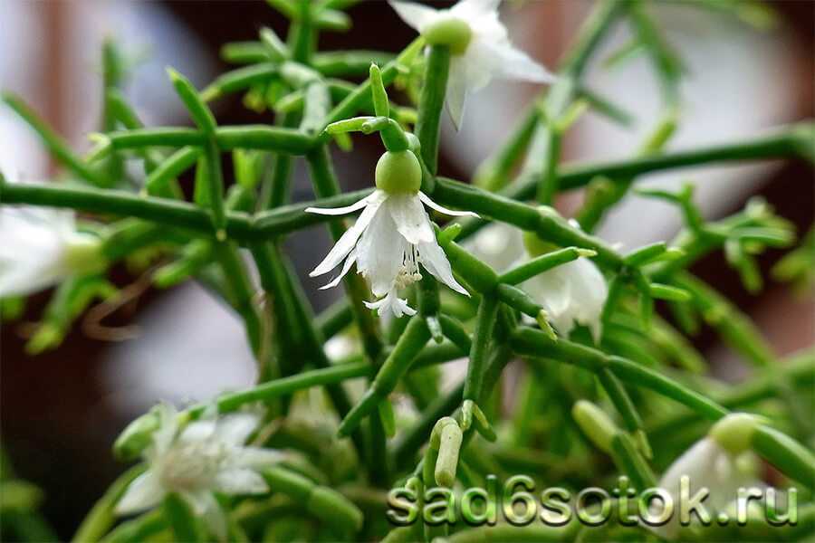 Зимой побеги усыпаны небольшими цветами нежно-розового, белого, желтого или оранжевого цвета. По окончании цветения стебли украшают ягоды, похожие на яркие бусины. Рипсалис можно выращивать как ампельное растение.