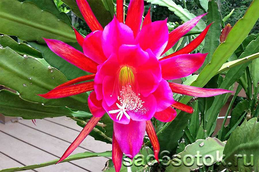 Не менее оригинальными выглядит кактус с волнистыми листьями. Ученые сделали выводы, что это даже не цветок, похожий на кактус, и не кактус, похожий на цветок. Очень трудно неспециалисту определить принадлежность к какому-либо роду. Но красивая листва, крупные красно-розовые цветы не имеют никакого отношения к традиционному понятию «цветок», ведь «Эпифиллум» – самый настоящий кактус. Количество сортов этого типа растения измеряется лишь разнообразием его окраса.